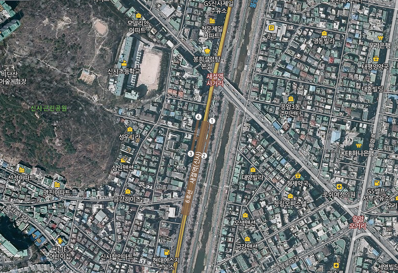 부역명이 신사인데, 이 지역이 신사동이기 때문. 그런데 3호선이 이미 신사역을 쓰고 있기 때문에 신사의 순우리말인 새절로 바꾼것이다.