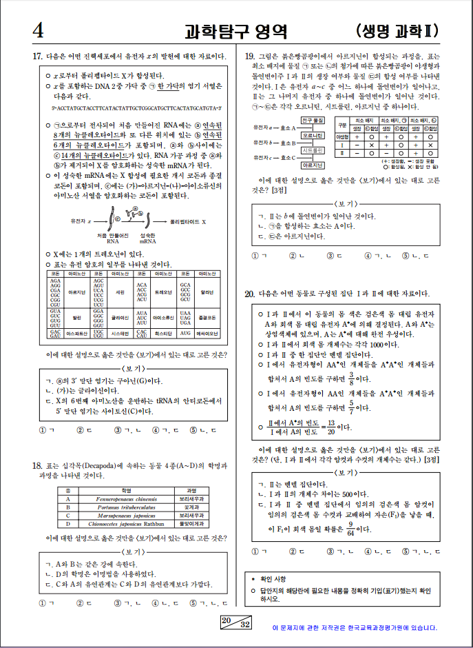 생명과학 II 역사상 가장 어려운 시험지로 꼽히는 2017 수능 생2의 문제들이다. 이 시험지의 1컷은 43으로 이때는 지금만큼 고이지는 않았다는걸 감안해도 역사적인 등급컷이다.특히 저 17수능의 코돈과 PCR 하디바인은 19수능까지 역대급으로 평가받았다.