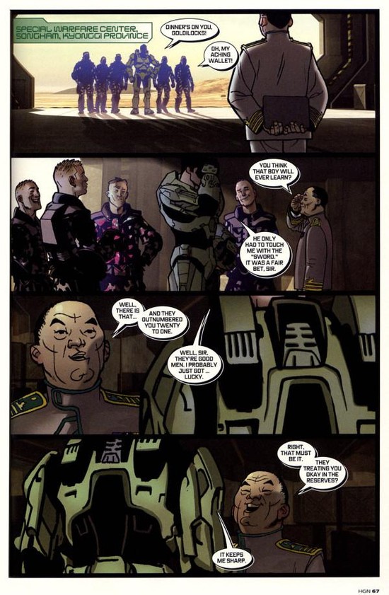 ▲ 아래에 후술할 헤일로 그래픽노블 '아머 테스팅'의 한 장면. 근데 배경보면 알겠지만 사막화가 진행되었는지 거대한 도시와 사막이 있다.
