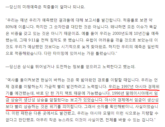 곰곰히 읽어보면 지금까지 일어났고 지금 일어나고 있는 일들을 다 예견했는데 이 양반이 97년도 아시아 외환위기를 예견할 수 있었던 단 한 가지의 팩트는