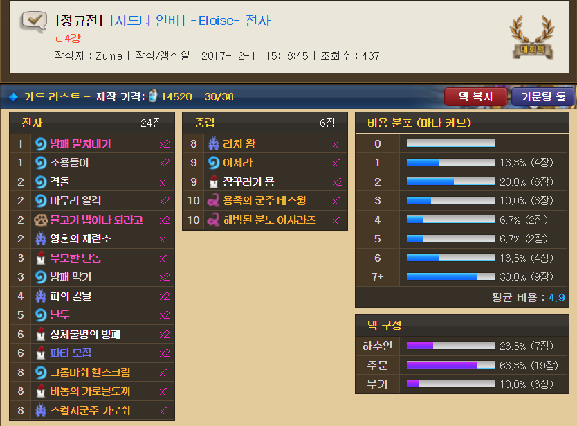 초반은 방밀전사처럼 틀어막다가 6코가 되면 파티 모집으로 이샤라즈를 뽑는다.