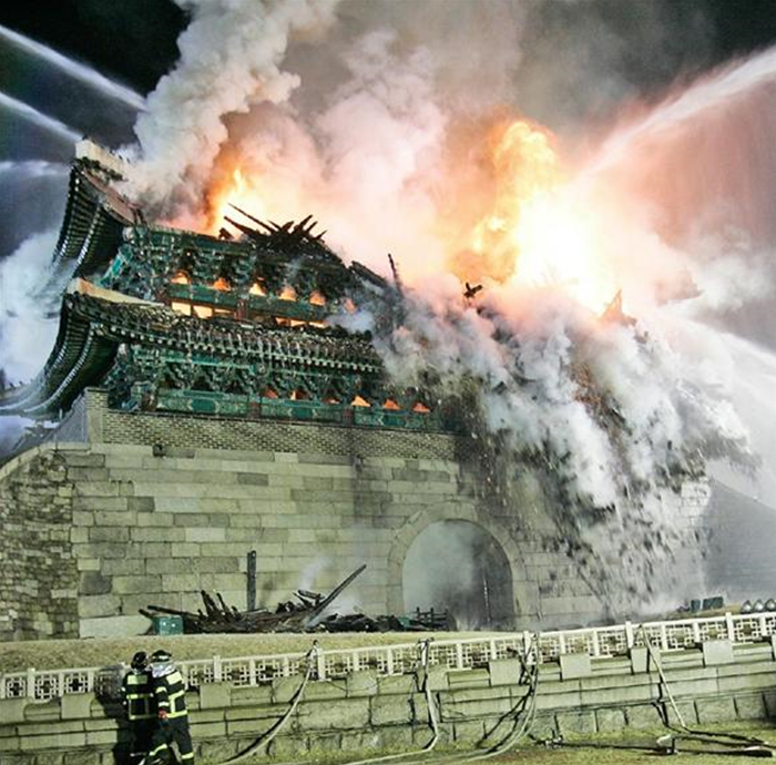 임진왜란과병자호란,일제강점기그리고6.25전쟁 때 서울의 융단폭격때도 건재함을 보였던 숭례문은 웬 미친 틀딱새끼에 의해 어이없이 깡그리 불타서 소실되었다. 당시 인식이 숭례문을 문화재로 보기보다는 그냥 일상적인 건축물로 봐서 보호하려는 시스템도 없었고 목조건물인데 화재에 대한 방비장치도 없었다. 그야말로 헬조센스러운 관리를 해놨던것이다.