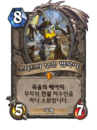 8코스트에 5/7 기계로 코스트에 비해 비교적 낮은 스텟을 가지고 있지만 죽음의 메아리 효과가 무작위 전설 하수인(근데 니가 쓰면 밀내초)를 소환한다.