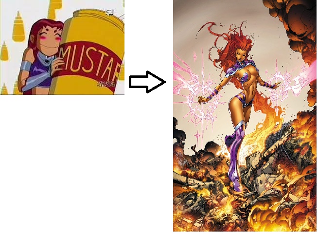 전에는 왜 귀여운 이미지에서 저렇게 변했냐고 써져 있었지만 원래 저런 섹스 어필 캐릭터였다가 틴 타이탄즈 애니메이션에서 한 번 귀엽게 나왔던것이 인기를 얻었던 것이다. 따라서 박음직한 모습이 원래 이미지다.