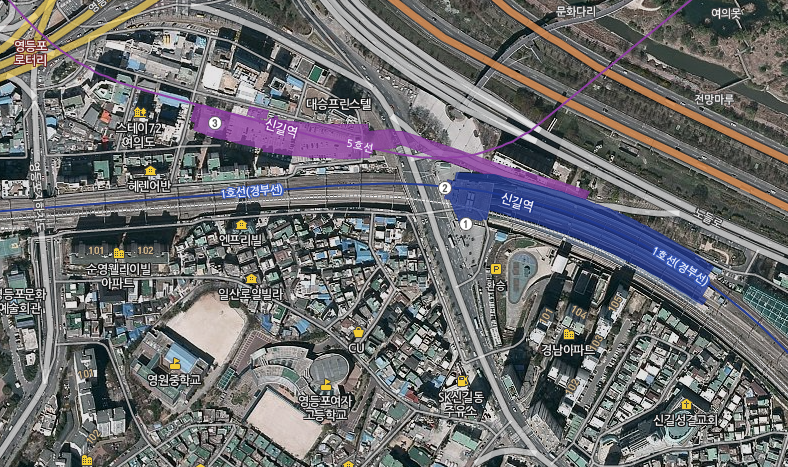 5호선은 영등포역하고 환승하려고 이 자리에 들어왔는데 개뜬금없이 꼴데 개새끼들이 영등포역을 500m나 서쪽으로 밀어서 그렇다. 원래 영등포역은 기차역과 전철역이 따로 있어서 지금 5호선 신길역에 가까운 자리에 영등포전철역이 있었음. 그렇게 역 위치 확정하고 5호선 공사 계획 확정나니까 뜬금없이 꼴데가 민자역사 짓는다며 역을 없애서 그렇다. 결국 다른데다가 1호선 신길역 만들어서 억지로 이은거임.