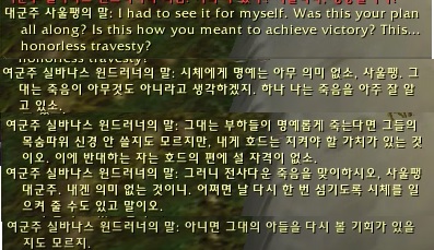 어쨌든 실바나스는 위의 대사처럼 결국 모두 자기를 섬기게 될 것이니 당장은 죽이지 않기로 한다. 이때 알레리아가 실바나스 뚝배기를 깨버렸어야 했는데...