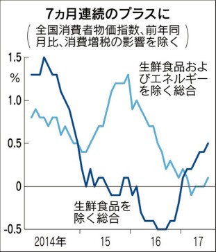 작년 마이너스였던 물가가 올해 들어서 지속적으로 상승하고 있다. 이 흐름대로라면 내년에는 1%가 넘어갈 확률이 높다. 다만 트럼프의 잇달은 폭탄 발언으로 엔화가 살짝 올라가는것은 걸림돌이다. 소비자물가지수 상승률이 0.7%까지 뛰어올랐다. 조만간 1%를 넘을 수도 있을 것 같다.