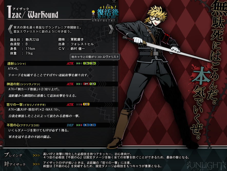 전용무기인 '디 앵거'(한국판에선 분노의 장검)를 장착할 시 스탠딩 일러스트가 비글로 변하고 정말 개처럼 싸운다. ㄹㅇ 근거리 미친개 됨