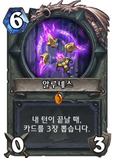 알루네스는 가장 강력한 전설 무기라고 생각되는데요. 끊임없는 카드 드로우는 퀘스트법사 뿐만 아니라 공격적인 메디브법사에게도 완벽한 카드입니다.