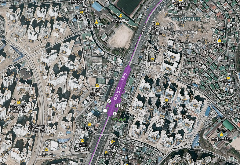 2면 2선의 상대식 승강장 역이며, 역 이름은 아현동의 옛 지명에서 유래되었다.