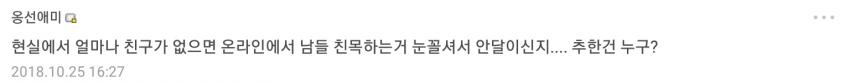 똑같은 고양이 사진 매일같이 병적으로 올리는데도 한결같이 우쭈쭈글 뿐이고 그이외댓 달리면 전원 풀발기해서 공격. 왜냐면 좆목을 안하면 내똥고양이엔 이쁘다는 댓글을 별로 안달아줌.