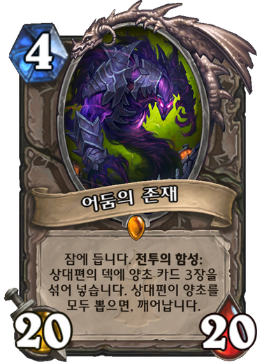 일반전에서 내 덱에 넣을 수 있는 지속 효과와 전함이 둘 다 붙은 1번째 하수인이다. 뭔 소리냐면 잠에 든다는게 전함이 아니라 지속 효과다. 그래서 비겁한 밀고자로 끌려나오거나 씹랄의 진화나 퇴화에서 나오면 양초도 안 주고 아무 상호작용 없는 철밥통이 된다. 내 필드의 자리 하나가 없어지는격