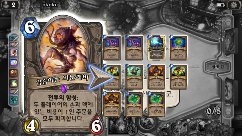 6코 4/6, 전투의 함성 : 두 플레이어의 손과 덱에 있는 비용이 1인 주문을 모두 파괴합니다.