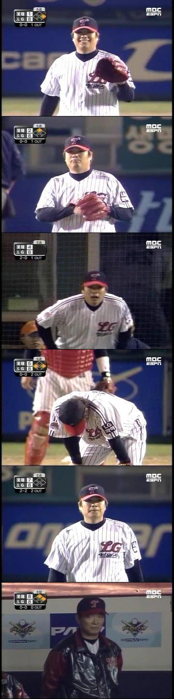 7회초 홍성민이 올라와 무난히 삼자범퇴로 막고 7회말이 되었다. 이동현이 2사까지는 무난히 막았으나 박종윤의 내야안타와 나경민에게 볼넷을 주게 된다. 참고로 이때 나경민은 독감에 걸린 이여상 땜빵으로 올라와서 좆크보 데뷔 첫 타석이었다.