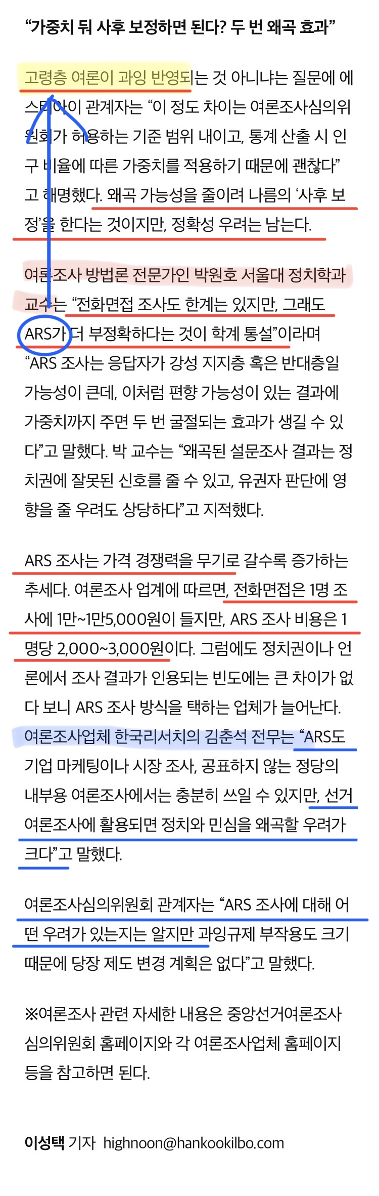 ARS도 마찬가지로 노인들만 응답할 확률이 매우높으니 조금이라도 ARS가 끼어있으면 여론이 왜곡된다. ARS는 어마어마한 분량의 기계음을 듣고 자신의 의견에 맞는 버튼을 누르는 방식인데 당연히 시간이 남아도는 노인들이나 응답하지 2030은 그냥 끊어버린다. 면접조사야 그냥 질문에 따른 답만하면 되지만 엄청난 분량의 기계음에서 나오는 자신의 의견에 맞는 버튼을 일일이 누른다는 것 자체가 엄청나게 번거롭고 귀찮은 일이다. 결국 귀찮음을 감수하면서도 ARS 조사에 임하는 사람은 시간이 남아도는 노인들 밖에 없으며 때문에 이에따른 여론 왜곡으로 미국에나 유럽에서는 ARS 조사를선거에 이용하는 것을 금지시켰다.