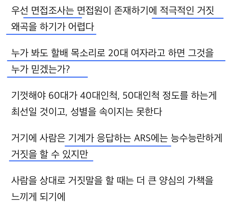 이런 어마어마한 분량의 기계음을 일일이 다 듣고 여론조사에 임하는 계층은 노인밖에 없고 최근에는 틀튜브에서 60대 이상은 할당량 다 차서 전화끊길 확률 높으니 응답률 낮은 20대로 속여 응답해라고 한다. 안그래도 2030은 ARS 응답률 낮는데 60대 이상이 20대로 속여 응답하니(면접조사는 목소리에서 티가 나기때문에 60대가 20대인척 하는게 불가능하다.) 2030의 여론이 반영될 리가 없다.