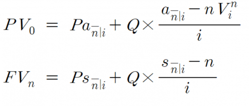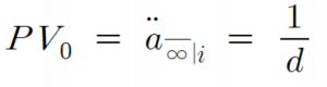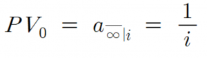 위의 연속 연금은 c_k = 1이고 순간이자율이 시간 t에 대해 독립적인 상수일 때의 경우(즉 순간이자율 = ln(1+i)일 때)의 계산식이다.