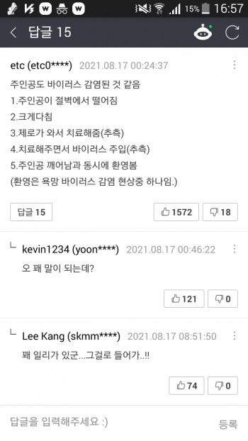 만약 군인들이 여기서 살아남는다면 엽총, 활 쏘는 꼬맹이들부터 시작해서 촉수괴물, 흑막세력으로 추정되는 회사까지 ... 전역한 후에도 마르지 않는 샘물수준으로 평생 안주거리일듯. 물론 전역하기전에 전국적인 괴물화사태로 전역은 생각도 못한채 평생 좆뺑이 쳐야하겠지만