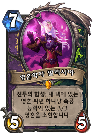 7코 5/5, 전투의 함성:내 덱에 있는 영혼 파편 하나당 속공 능력이 있는 3/3 영혼을 소환합니다.
