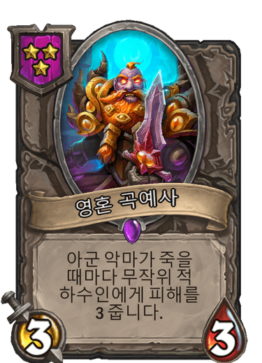 3성 3/3 (6/6), 아군 악마가 죽을 때마다 무작위 적 하수인에게 피해를 3 줍니다. (2번 발동합니다.)