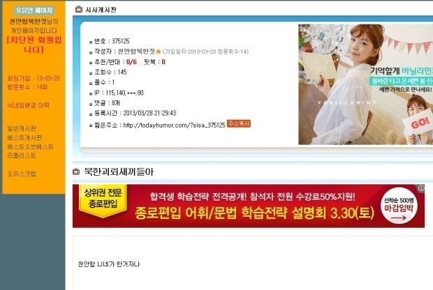 만약 블로그를 운영하고 오유를 하는 새끼가 있다면 무조건 피해라!!너한테 피해 갈지도 모른다. ㄴ 이미 정치계열 블로그를 운영한다고 한 시점에서 답이없다.