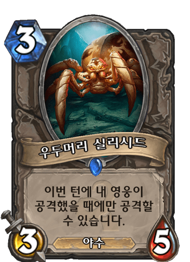 3코 3/5에 야수 종족값이 달리고 이번 턴에 내 영웅이 공격했을 때에만 공격할 수 있습니다.라는 희대의 쓰레기 효과를 들고왔다.