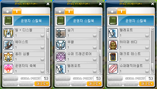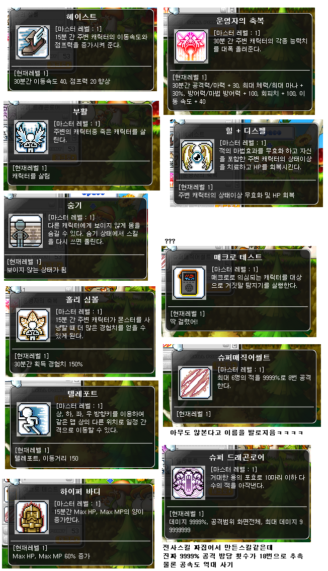 스킬 설명을 보자. 내용을 보면 상당히 막장이다. 이름부터 슈퍼 매직어썰트와, 슈퍼 드래곤로어다. 존나 초딩 작명 센스다. 어차피 볼사람 없다고 이름을 대충 적어둔 모양이다. 현재 삭제되어서 메이플에서는 볼 수 없는 마법사 스킬 매직클로가 운영자 스킬로는 남아있다. 9999%로 8번을 공격한다. 지린다. 드래곤 로어 스킬도 운영자 스킬로 남아있는데 데미지 제한까지 풀려있다. 범위의 사기라고 불리던 다크나이트의 드래곤로어가 운영자한테 있다니.