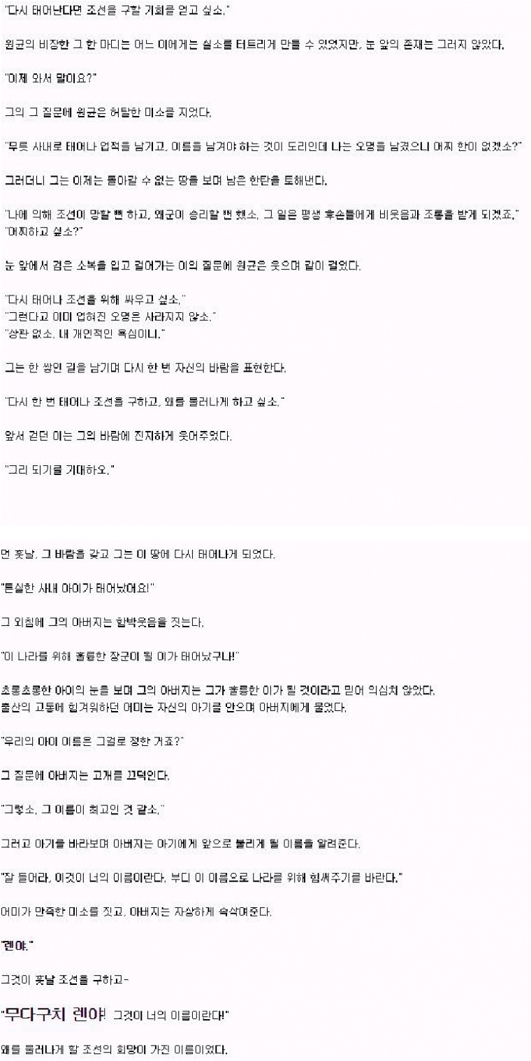 시발 이런 얘기를 만들 정도면 원균이 얼마나 개병신같이 무능했는지 알 수 있다. 무타구치 렌야는 사람 구실이라도 했지 자기 나라 백성 죽여놓고 적군 수급이라고 구라친 좆균새끼를 렌야랑 비교한다는 거 자체는 실례다. 저건 렌야 입장도 들어봐야 할 일이다 시발. 둘 다 무능한 건 펙트이긴 한데 원균이 더 사람 새끼가 아니었지 시발