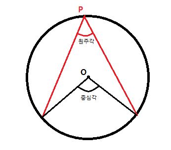 원의 둘레 위에 점P를 딱 찍어라. 그리고 그 P에서 출발하는 서로 다른 현 두 개를 그어라. 그 현 두 개가 이루는 각이 바로 원주각이다.