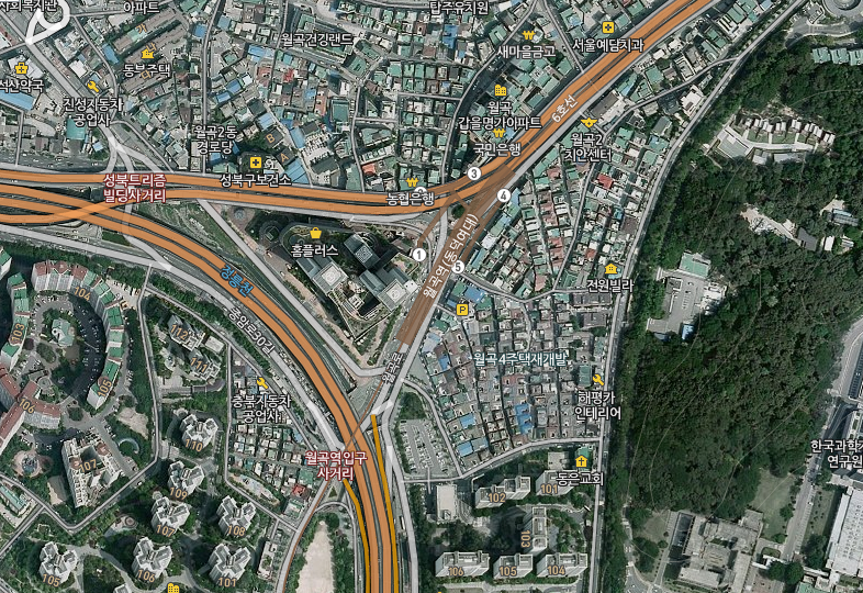 상월곡역과 월곡역이 아주 가까운 위치에 있고 역 위로는 북부간선도로와 내부순환로가 만나는 지점이 있다.