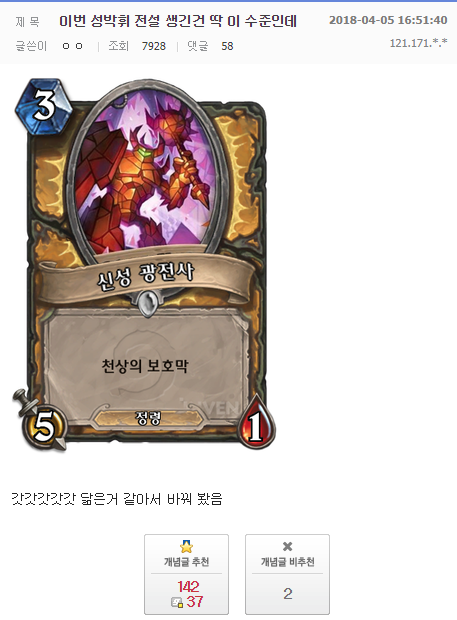 ㄴ 진지빨고 씨발 일러 하나는 훌륭한 씹서 전설을 왜 이딴 카드로 냈을까 의문이다. 와우 위키까지 뒤져가면서 검색해도 없는거보니 오리지널 캐릭터같은데 진지하게 저 합성짤이 훨씬 어울린다. 존나 잘만들었네