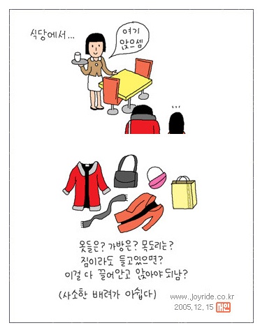 (좁은 식당에 불평하며) 옷들은? 가방은? 목도리는? 짐이라도 들고있으면? 이걸 다 끌어안고 앉아야 되남? |