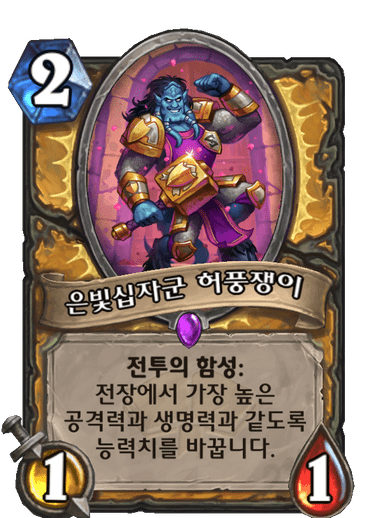2코 1/1, 전투의 함성:전장에서 가장 높은 공격력과 생명력과 같도록 능력치를 바꿉니다.