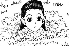 키르아를 잡으려고 할 때 키르아를 죽이겠다는 히소카에게 살기를 들어내 그만 키르아한테 들킨다. 귀요미. 넨으로 자살돌격 인형들을 잔뜩 만들어내 어떻게든 동생들을 만류하려고 한다.