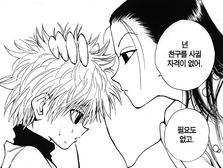 헌터시험 마지막 순간에 키르아보고 너에게 친구는 필요없다며 집으로 돌아가라(키르아는 가출했다.) 하지만 암살가문 후계자인 동생의 처지를 생각해보면 어찌보면 맞는말이다.