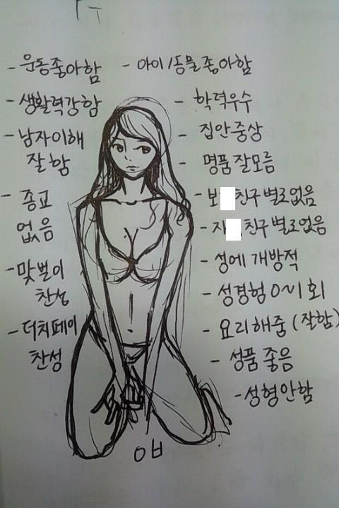 한국냄져는 아니어야 하며 잘생기고 키크고 착한데다 가방끈 길고 돈많고 꼬추크고 테크닉까지 좋아야하며, 남성우월주의 사상 없고 성매매 경험 전무에다가 섹스 경험도 0~1번이여야 한다.