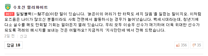 현역병 안간 것만으로도 나한텐 모든 게 다 감사하다. 심지어는 나를 욕해도 감사하다. 이영표 아버지도 완전 고맙다. 군대 안가는 건 엄청 큰 상이므로 그 상에 대한 보답으로 이영표 아버지께서 지적하신 대로 다 뜯어고치겠다. |