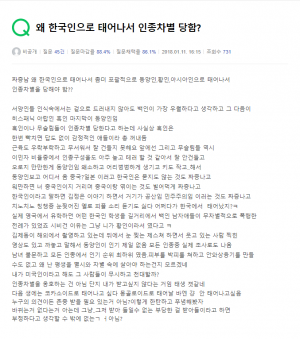 한국에서도 이웃집 찰스만 봐도 인종차별이 심각한데 해외에서 이런 대우 받으면 홈그라운드에선 되갚아주고 싶은건지 아주 극혐이다. 인종차별 당하는 입장은 존나 서러우니까 머리에 개념이 조금이라도 있다면 하지 말자. 어릴 때부터 인종차별을 꾸준히 당하다가 애꿎은 사람들에게 총탄을 휘날린 게 조승희다. 제에에에발 좀 씨발 안전한 사회 좋아하면 인종차별 좀 그만해 개새끼덜아.