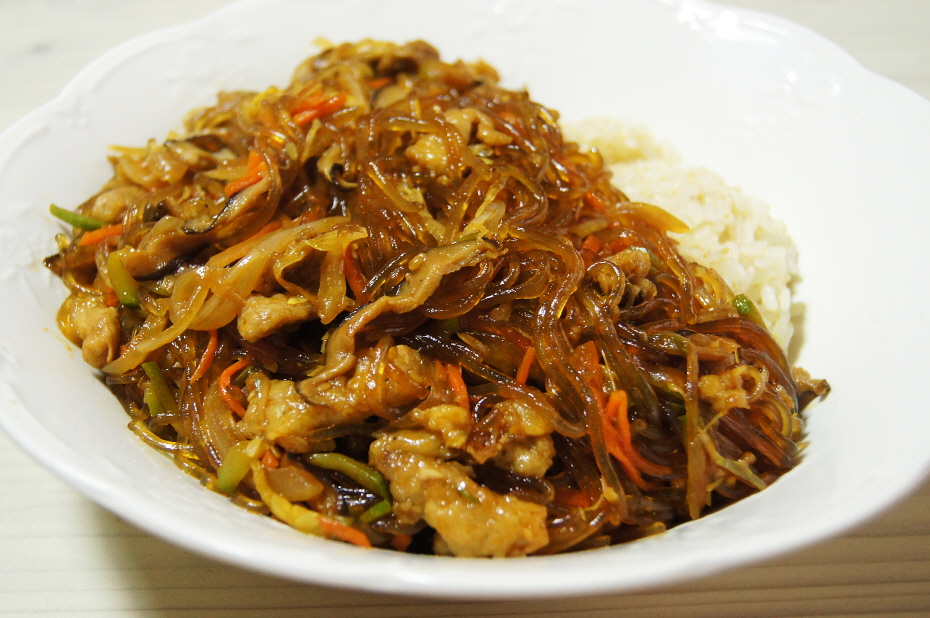 잡채를 밥위에 얹어 비벼먹는 음식이다.