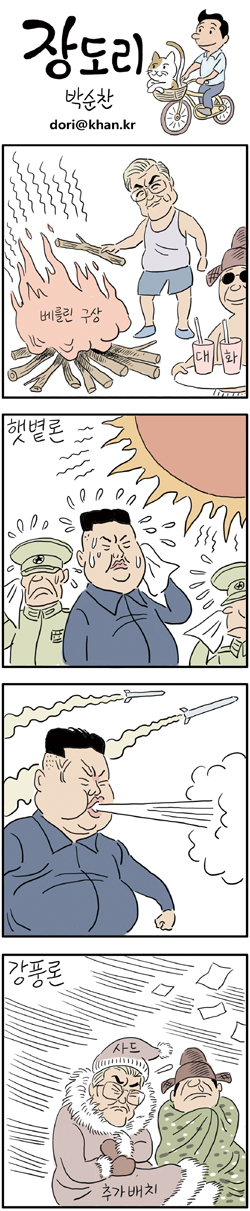 김정은이 미쳐서 미사일을 쏴도, 절대 북한만 까지 않는다. 당장 북한이 도발할때 장도리가 그린 만화를 보면 북풍이온다고 하거나, 야당도 싸잡아서 깐다. 솔직히 야당이 병신인건 맞지만, 야당은 한것도 없는데 같이까고 있다. 당장 천안함때 그린 만화만 봐도 '장교들은 도망치고 병사들만 뒤졌다~' 이런식으로 그려놓았다.