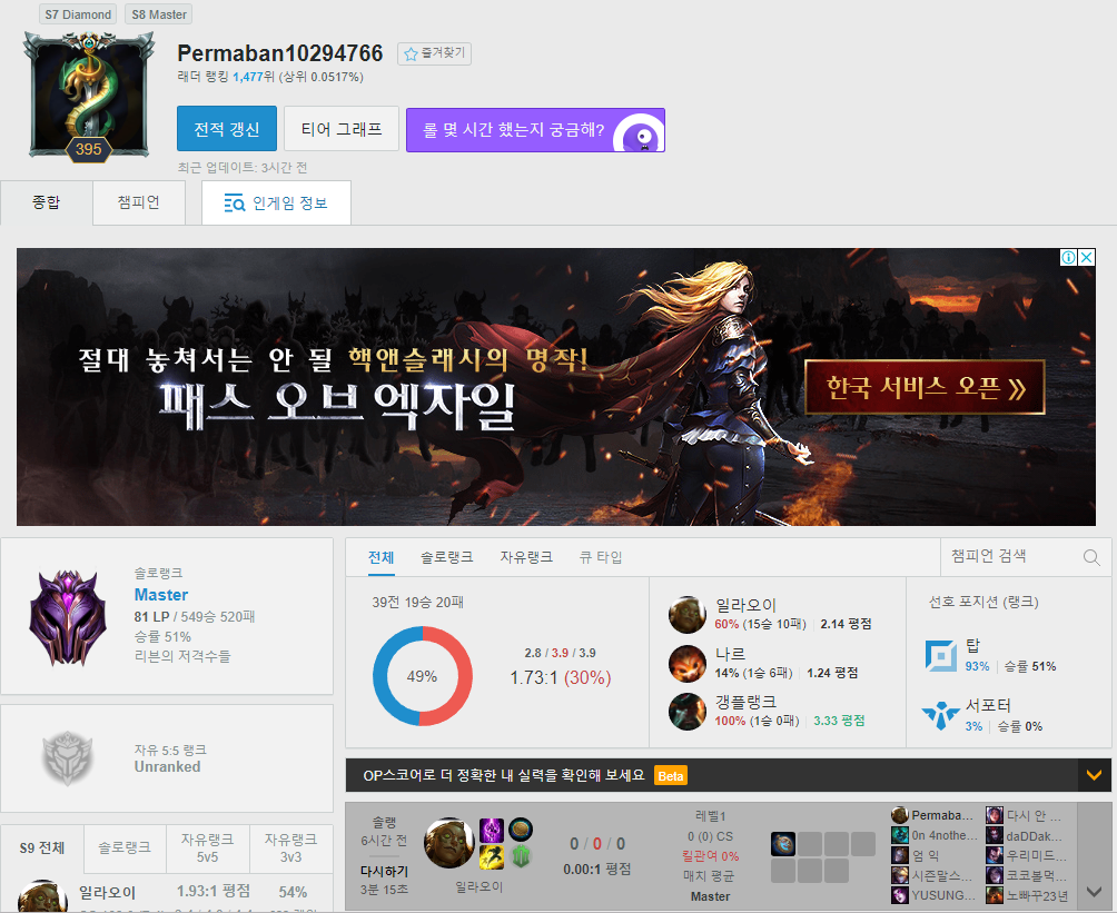솔랭 7일전 더이상 전적갱신이 되고있지않다. 알바를했거나