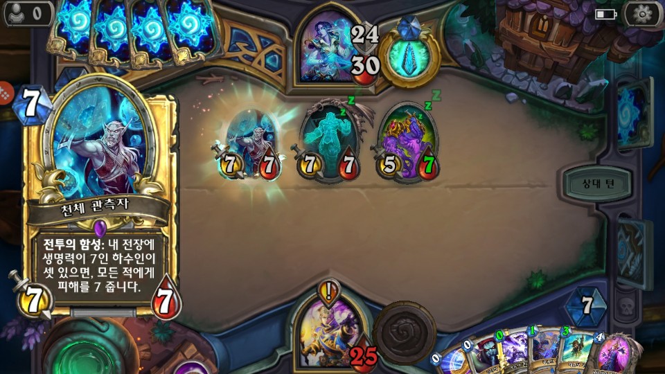 7코 7/7, 전투의 함성:내 전장에 생명력이 7인 하수인이 셋 있으면, 모든 적에게 피해를 7 줍니다.