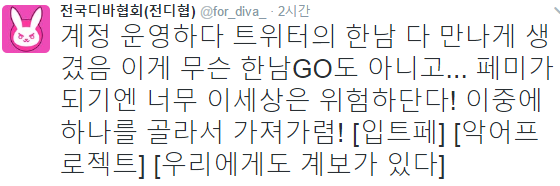 D.Va를 앞에 내세워 페미니즘을 한다고 자위하는 페미나치 메오후 집단. 야 씨발 D.Va한테 페미니즘 묻히지 마라.