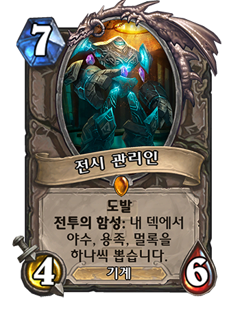 7코스트 4/6 기계, 도발, 전투의 함성 : 내 덱에서 용족, 야수, 멀록 카드를 뽑습니다.