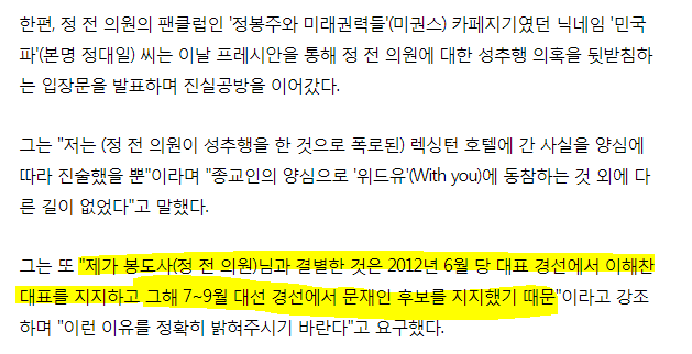 라고 밝히며 일부에선 의도적으로 정봉주가 거짓말을 했다며 지목했다.