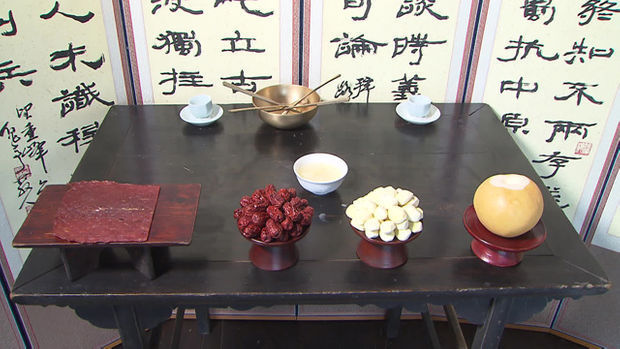 - 족보를 사다가 사칭하는 모씨: 밥 60그릇, 떡 35그릇, 쇠고기 100근, 돼지고기 120근, 닭 55마리, 술 75병, 전 2,000장, 사과 200개, 배 150개, 감 85개, 대추 700개, 북어 40마리