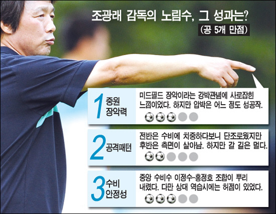 2. 전술 = 10점(진정한 실력자는 이기는 경기만 계획하지않는다. 때론 세계의 평화와 더불어사는 지구공동체 사회를 만들기위해 양보하는 경기도 기획하는 더욱 더 큰그림을 그리는 법.축구계의 간디 조광래님의 숭고한 고행덕분에 이 지구에 사람사는 맛이 난다.)