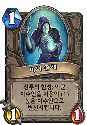 - 사기 증진 - 전사 주문, 1코, 하수인에게 피해를 1 줍니다. 그 하수인이 생존하면, 무작위 졸개를 내 손으로 가져옵니다.