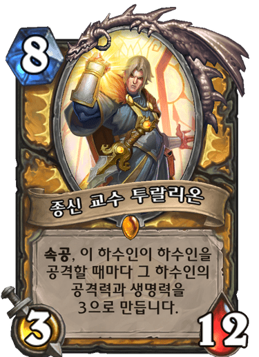 8코 3/12 속공, 이 하수인이 하수인을 공격할때마다 그 하수인의 공격력과 생명력을 3으로 만듭니다.