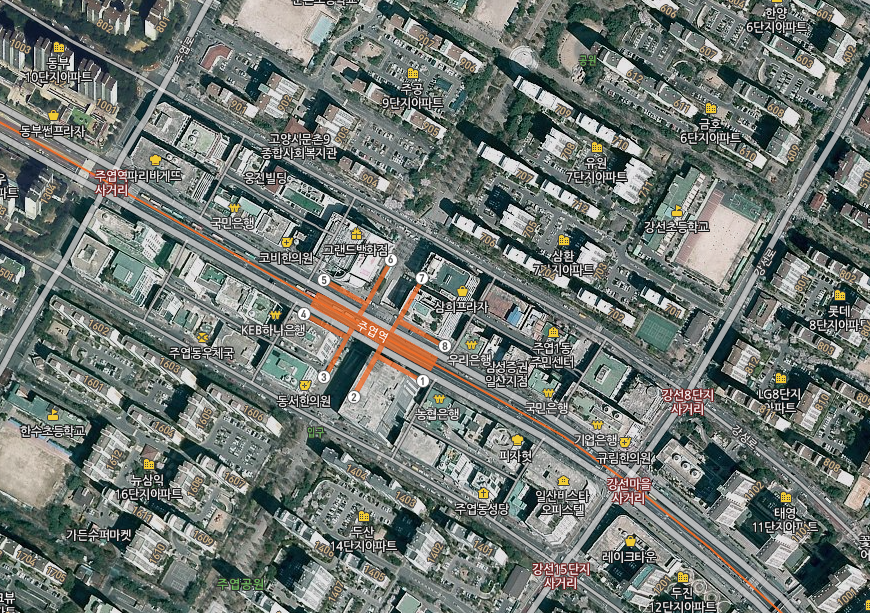 주엽공원이 전철 방향에 가로질러 있다. 참고로 나름 번화함